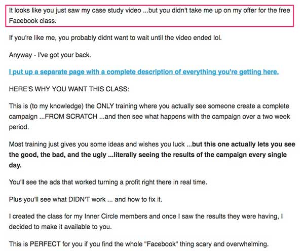 Mientras ella exploraba el sitio de Frank Kern, decidió revisar un video. Poco después de ver el video, este es el email que recibió: