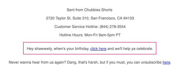 Chubbies añade esta pequeña nota en el pie de página de todos los emails que envían. Te invitan a compartir tu información de cumpleaños en su estilo humorístico. Y hacen obvio que con eso habrá algo para ti.