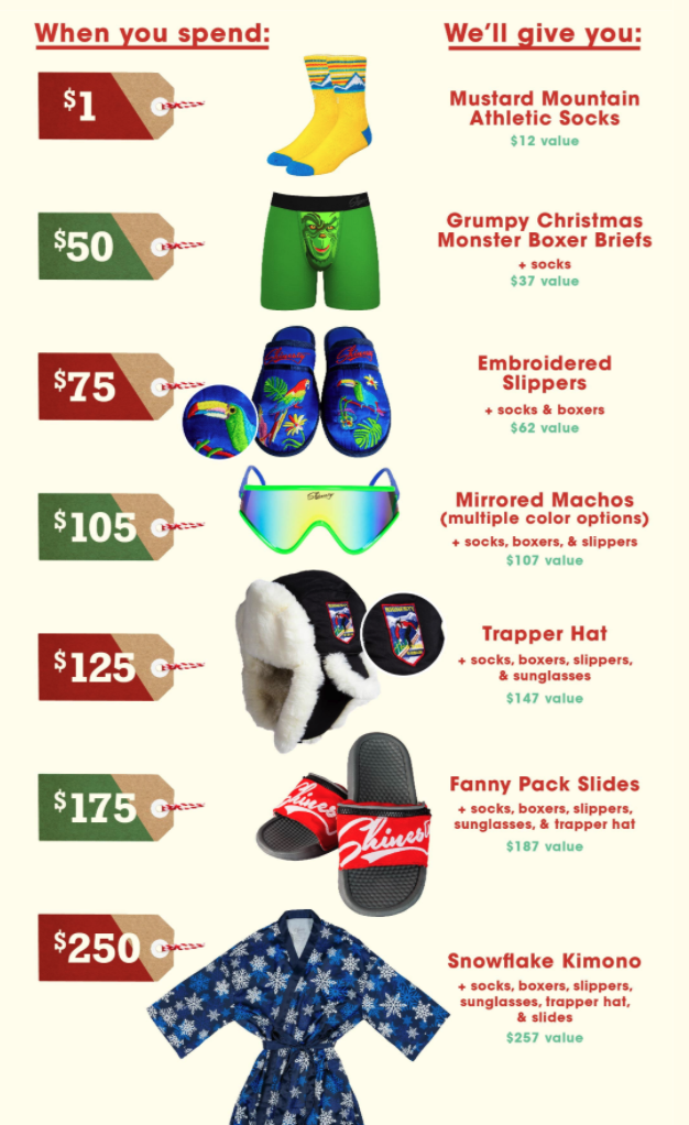 Contudo, em vez de presentear todos os clientes da mesma maneira, a Shinesty habilmente oferece produtos gratuitos com base em quanto você gasta. A empresa também torna seus presentes mais atraentes, atribuindo a eles um valor em dólares.