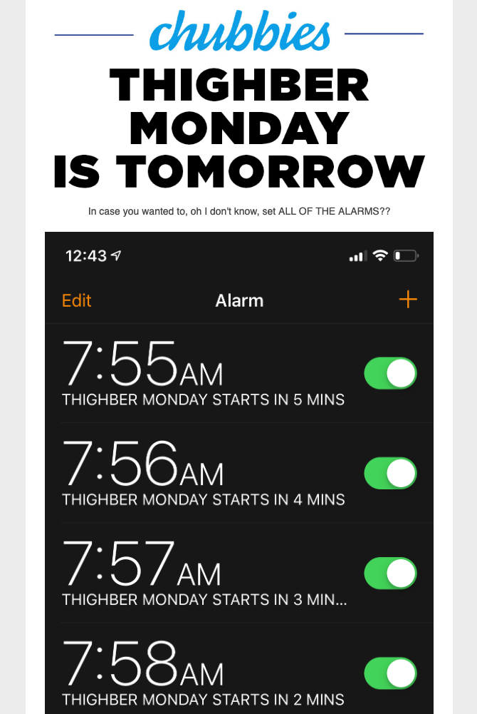 Se você está se perguntando como e por que a Chubbies cancelou a Black Friday, é necessário abrir o e-mail. (Certamente que sim, falarei mais sobre isso na Estratégia #8.)