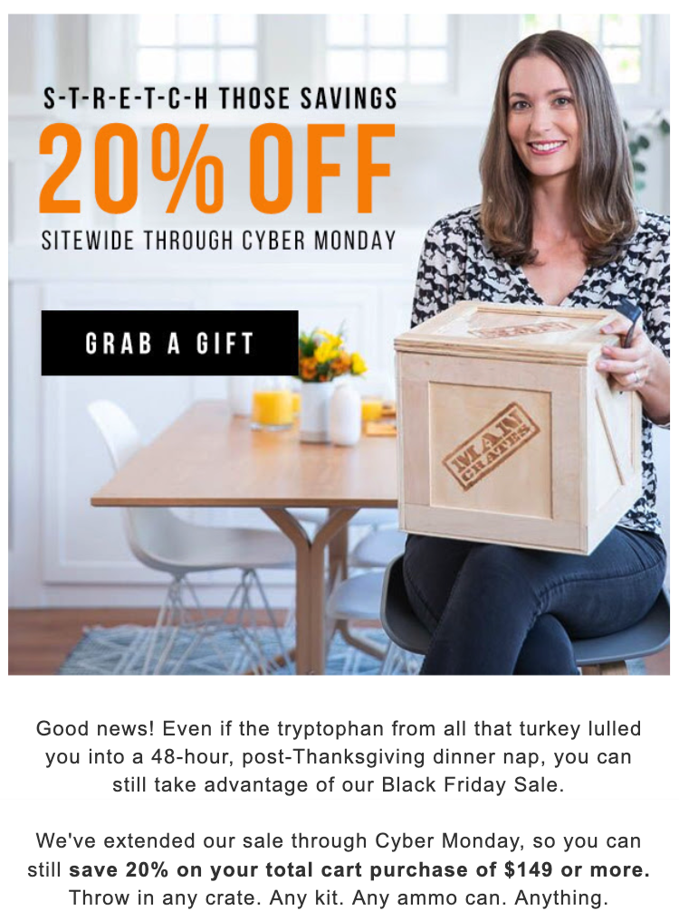 A Man Crates informa que estendeu suas ofertas da Black Friday para a Cyber Monday, que é o dia de compras online do ano.