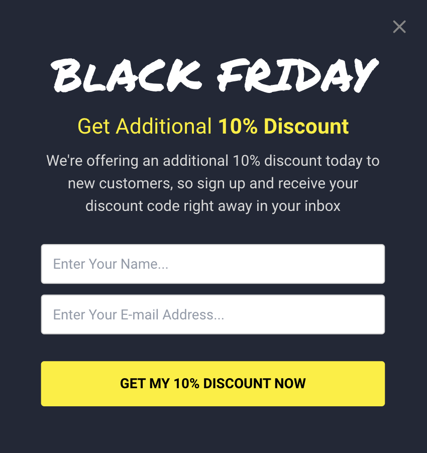 Use o tempo antes da Black Friday através do pop-up de e-mail para coletar clientes potenciais para os quais você pode enviar e-mails promocionais. Isso antes, durante e depois da Black Friday.